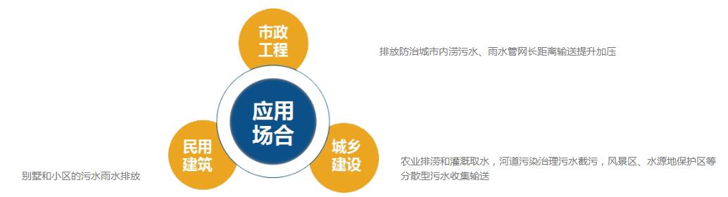 广泛应用于市政工程、工业或其他一切不能依靠重力作用直接把废水排放到污水处理系统的建筑。其中,市政排水适用于污水泵站、排水泵站、合流泵站等中途泵站。 液体:城市污水,雨水、排水、废水和源水。 体温度低于40℃,液体PH介于4~10之间